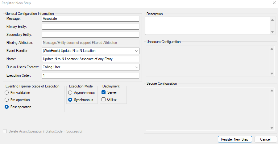 Last step is to register a step for the plugin which is what will will trigger the hook when something is changing in Dataverse. In this Scenario the message will be Associate and set as below.